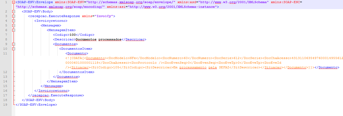Após os procedimentos acima, o InvoiCy irá retornar o status atual da inutilização. O layout de retorno da inutilização é o mesmo do envio e de eventos, como mostra a imagem abaixo.