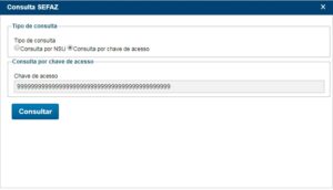 Essa tela contém o botão ‘Consultar na SEFAZ’, que faz a busca diretamente na SEFAZ e download dos documentos emitidos contra a empresa. Ao clicar nesse botão será aberta uma nova tela para escolher o tipo de consulta, que pode ser ‘Consulta por NSU’ ou ‘Consulta por chave de acesso’.
