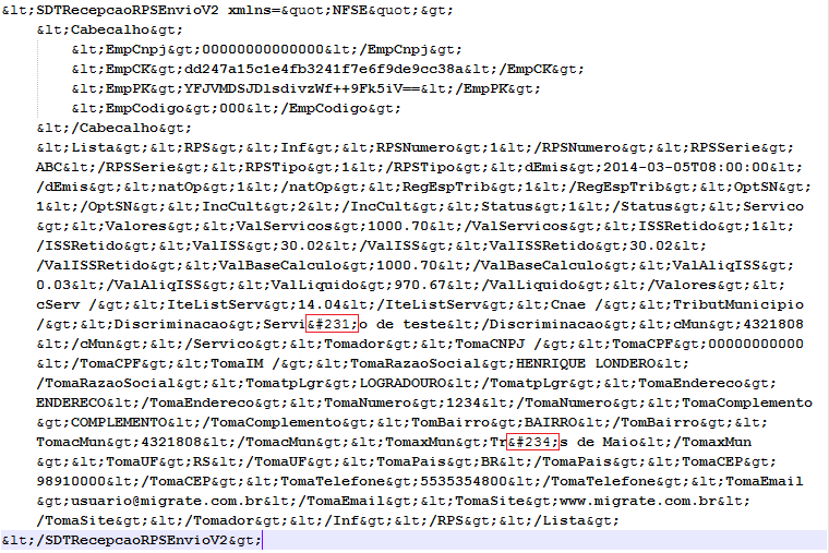 7. XML com os caracteres especiais/símbolos substituídos pela Entity number: