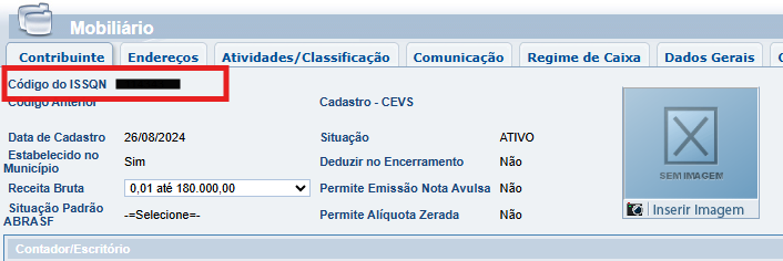- Inscrição: Esse código pode ser encontrado acessando o sistema da prefeitura. No menu Cadastros > Mobiliário > Código do ISSQN.