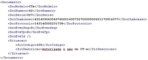 Note que na TAG <Documento> é retornado o conteúdo XML do retorno, codificado em “CDATA”. Este conteúdo pode ser lido pelo ERP para atualização do Status do documento.