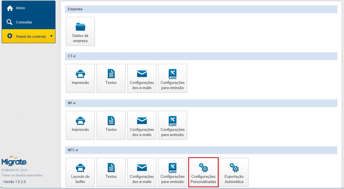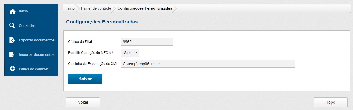 Para isso, adicionou-se a Plataforma a opção de configurar um diretório para onde os arquivos XML serão exportados. Essa configuração se dá através do Painel de Controle, Configurações Personalizadas no Módulo NFC-e, como demonstra a imagem a seguir. Destacando que apenas os usuários com o Perfil de Administrador e Parceiro terão acesso a essa tela.