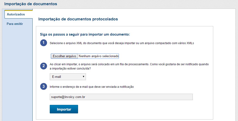 Na tela de importação de documentos, primeiramente encontra-se a aba “Autorizados” onde tem a opção de importar um arquivo proc.xml, ou um arquivo compactado com vários proc.xml. Poderá escolher também a forma como será notificado assim que a importação estiver concluída, onde as opções são: “E-mail”, “Notificação no Invoicy”, “E-mail e Notificação no Invoicy” e “Não notificar”. Se a opção selecionada for e-mail aparecerá em tela um campo para informação do endereço de e-mail.