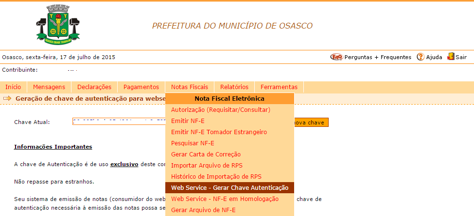 A comunicação com os Web Services requerem uma “chave de autenticação” gerada no sistema da prefeitura, cada chave é única e a mesma deve ser informada no cadastro da empresa junto ao InvoiCy, para que o mesmo utilize a chave tanto na emissão e cancelamento, esta chave é responsável pelo reconhecimento do prestador no sistema da prefeitura. Para acessar ou gerar uma nova chave deve-se acessar o menu “Notas Fiscais -> Web Service – Gerar Chave Autenticação”, como apresentado na imagem abaixo: