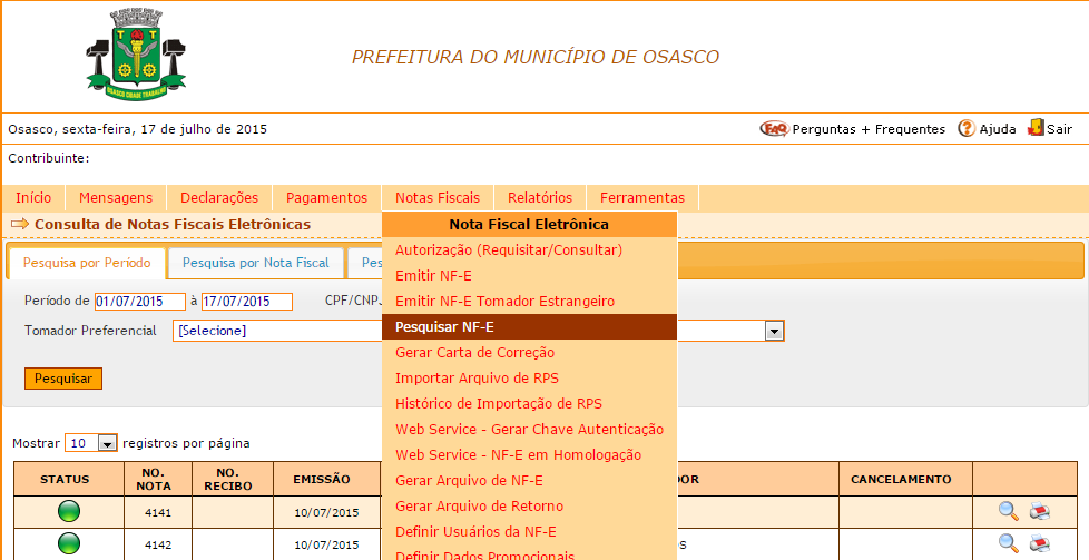 Para consultar os dados de uma nota fiscal, o usuário poderá acessar ao sistema web disponibilizado pela prefeitura através do menu “Notas Fiscais -> Pesquisar NF-e”, após isso será necessário informar os filtros que desejará aplicar, clicar em pesquisar e o sistema irá carregar uma grid com as notas que se enquadrem para os filtros aplicados.