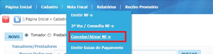 Após realizar o login no portal, através do menu “Nota Fiscal”, o usuário deverá clicar na opção “Cancelar / Ativar NF-e”, de acordo com a imagem: