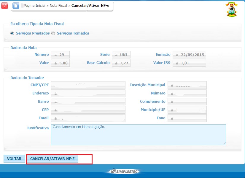 Ao clicar no botão o usuário será novamente redirecionado, desta vez para uma tela que contém as principais informações da NFS-e a ser cancelada, antes de clicar em “Cancelar / Ativar NF-e”, o usuário deve escrever uma justificativa para a realização desta ação.