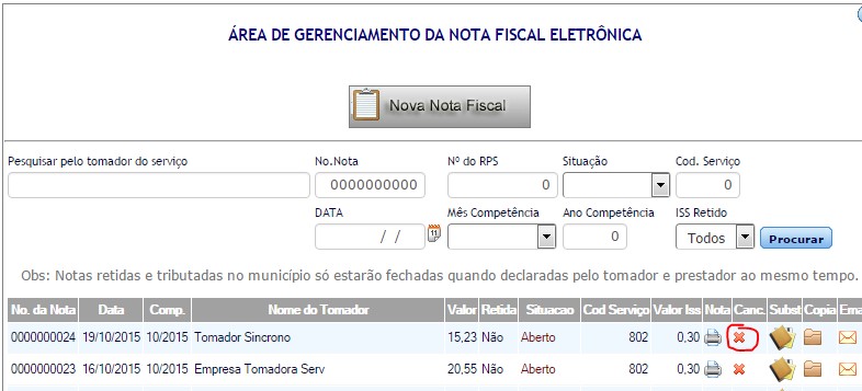 Atualmente apenas um único município não disponibiliza cancelamento de NFS-e via web service, o município de Maracanaú / CE, neste caso é necessário realizar o cancelamento diretamente no sistema da prefeitura. Ao acessar a área de Gerenciamento da NFS-e, deve-se clicar no botão disponível na coluna “Cancelamento” da grid dos dados: