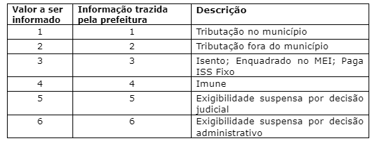 O campo de natureza da operação deverá seguir o padrão ABRASF: