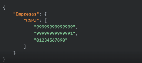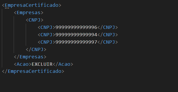 Para integração via API REST, adicionamos um novo método DELETE ao endpoint companiescertificates. Para realizar a exclusão de certificados digitais, basta enviar um ou mais CNPJ ou CPF, conforme modelo a seguir.