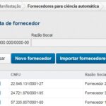 Ao clicar no ícone você poderá consultar a lista de fornecedores, bem como cadastrar novos fornecedores ou importar através de um arquivo .csv. A estruturação desse arquivo deve ser o seguinte: CNPJ;Nome do fornecedor. Clique aqui para visualizar um exemplo.