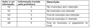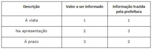 As formas de pagamento devem ser seguidas conforme a tabela relacional do município: