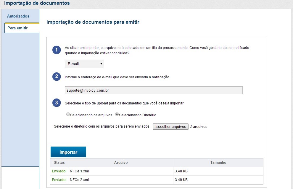 Na tela de importação de documentos, primeiramente encontra-se a aba “Autorizados” onde tem a opção de importar um arquivo proc.xml, ou um arquivo compactado com vários proc.xml. Poderá escolher também a forma como será notificado assim que a importação estiver concluída, onde as opções são: “E-mail”, “Notificação no Invoicy”, “E-mail e Notificação no Invoicy” e “Não notificar”. Se a opção selecionada for e-mail aparecerá em tela um campo para informação do endereço de e-mail.