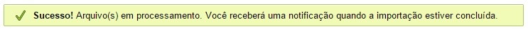 Após a importação do documento, aparecerá em tela uma mensagem informando ao usuário que o arquivo foi processado com sucesso, e que o mesmo será notificado quando a importação estiver finalizada.
