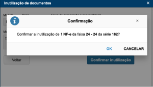 Em seguida será necessário confirmar se você realmente deseja inutilizar essa faixa de documentos informados, através do botão “Confirmar”, como demonstra a imagem a seguir.