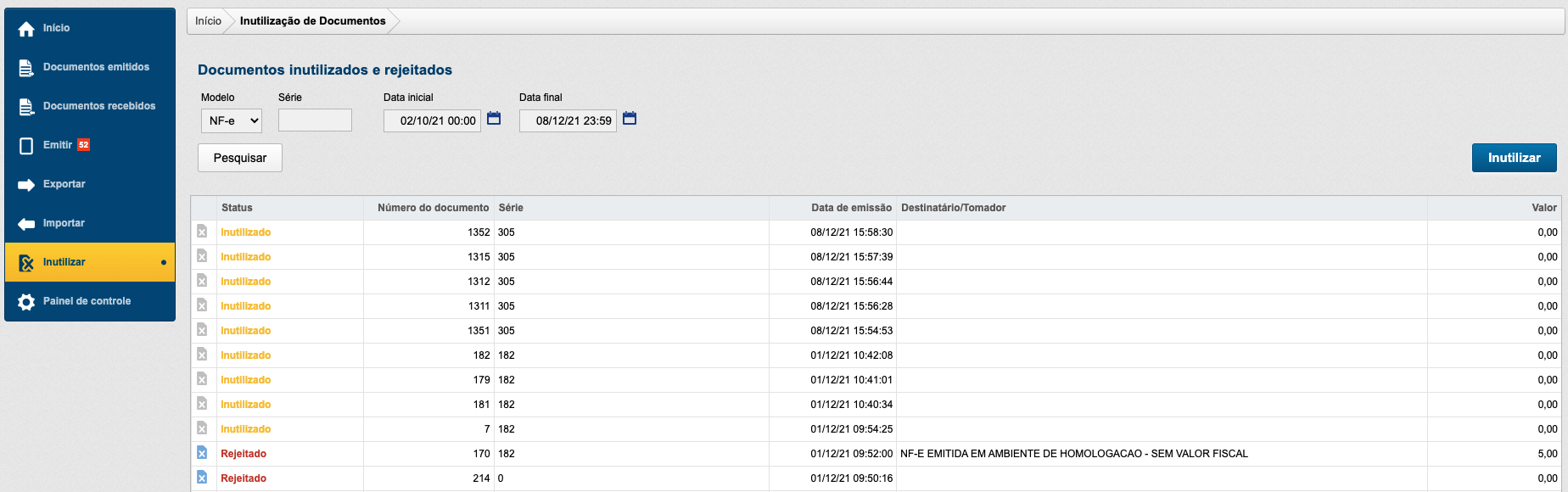 Ao confirmar a inutilização, no final do processo será apresentada uma mensagem em tela, informando sobre o status do processo.