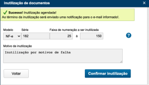 Quando a faixa informada ultrapassar mais de 101 documentos a inutilização será agendada, então juntamente com a tela de confirmação o usuário deverá informar um endereço de e-mail para receber uma notificação com os detalhes do processo. Esse campo já virá preenchido com o e-mail do usuário logado na aplicação, mas podem ser informados vários endereços de e-mail, separando os mesmos com um “;”.
