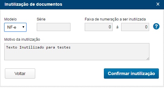 Para inutilizar os documentos, basta clicar no botão Inutilizar, posicionado ao lado direito da tela. Abrirá então uma nova tela, onde você usuário deverá escolher o modelo de documento que deseja inutilizar, informar a série, faixa de numeração e o motivo da inutilização, e clicar no botão “Confirmar inutilização”, conforme a imagem abaixo.