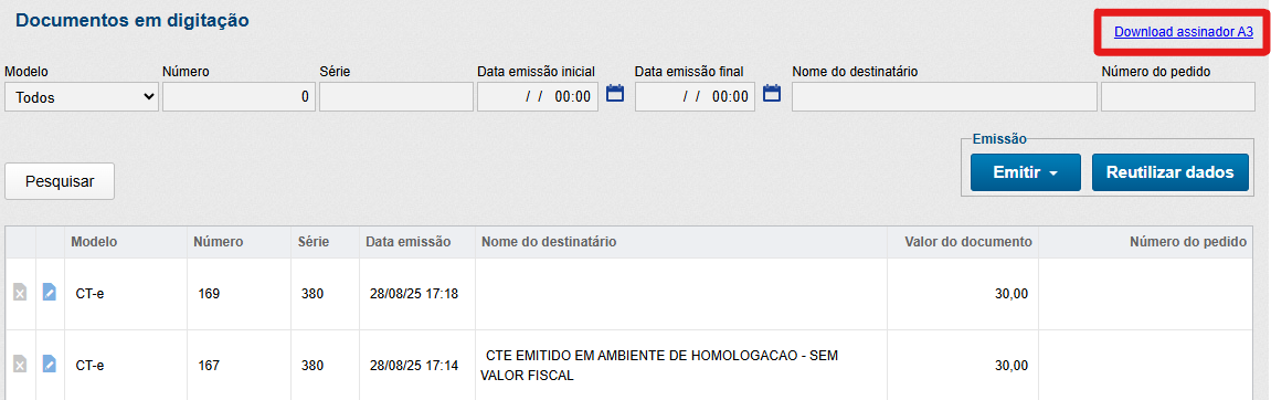 Com o intuito de realizar a digitação de um documento fiscal utilizando o certificado A3, efetue o download do assinador A3, um programa que permite a conexão do certificado A3 de sua empresa com o InvoiCy. Esta opção se localiza em "Emitir" no menu principal do InvoiCy, conforme evidenciado abaixo: