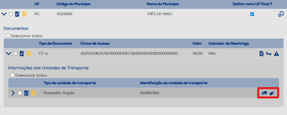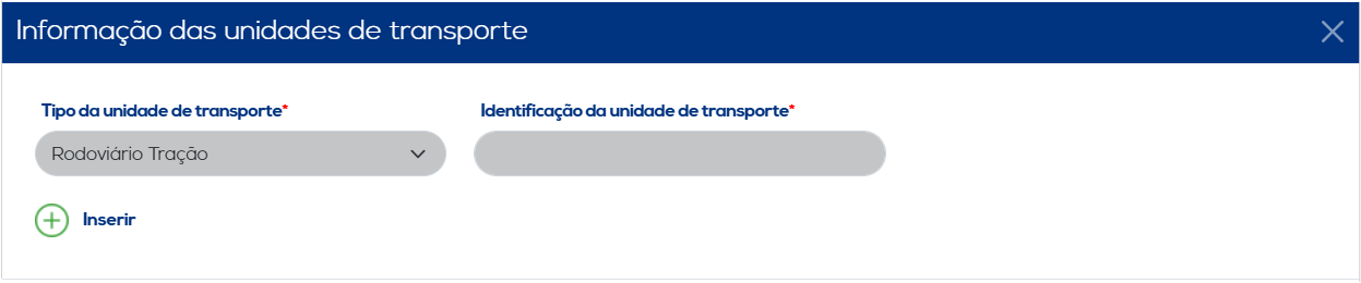 No segundo ícone, serão apresentados os campos relacionados às informações da unidade de transporte. Ao concluir a inclusão dos dados, clique no botão "Inserir" para salvar as informações. Os dados inseridos serão listados, juntamente com as opções de editar e excluir.