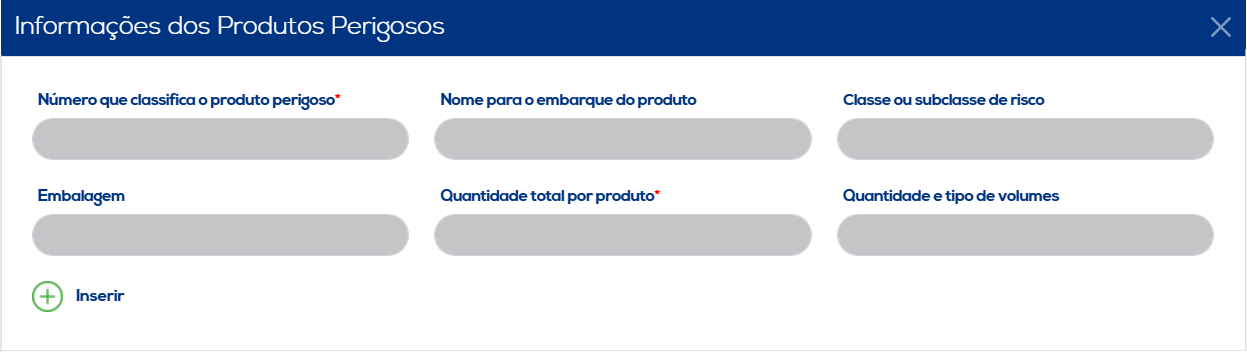 No ícone "Informações de Produtos Perigosos" é possível indicar se a carga referente ao documento vinculado ao MDF-e possui algum item que apresente perigo, preenchendo as informações solicitadas. Ao concluir a inclusão dos dados, clique no botão "Inserir" para salvar as informações. Os dados inseridos serão listados, juntamente com as opções de editar e excluir.