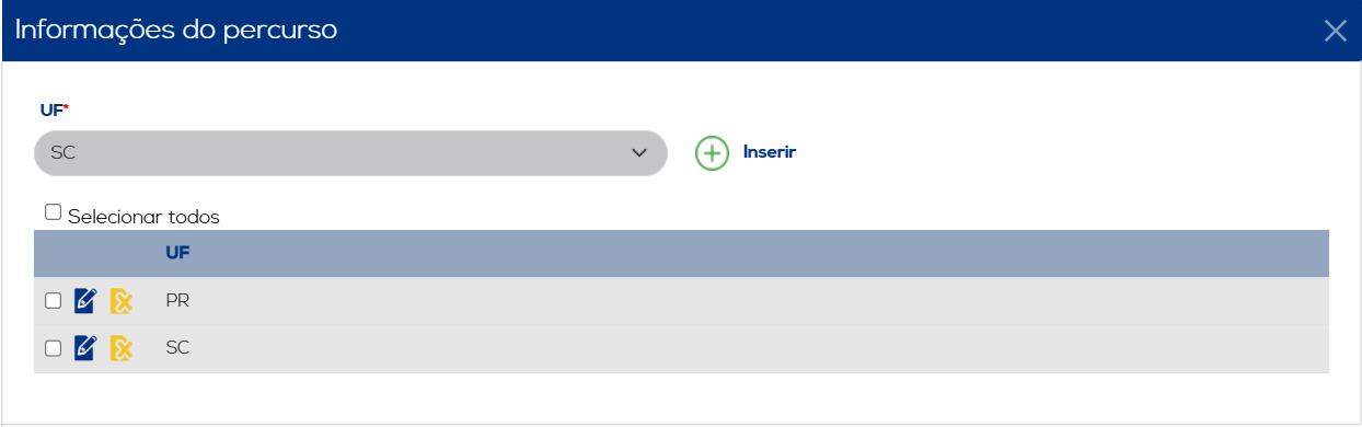 Informações do Percurso: Informe todos os estados (UFs) que o transporte precisará percorrer até chegar ao destino, no descarregamento. Como por exemplo, se o estado de carregamento é São Paulo (SP), e o estado de descarregamento é o Rio Grande do Sul (RS), o usuário precisará informar no percurso todos os estados (SC, PR) por onde ele passará até chegar ao destino final.