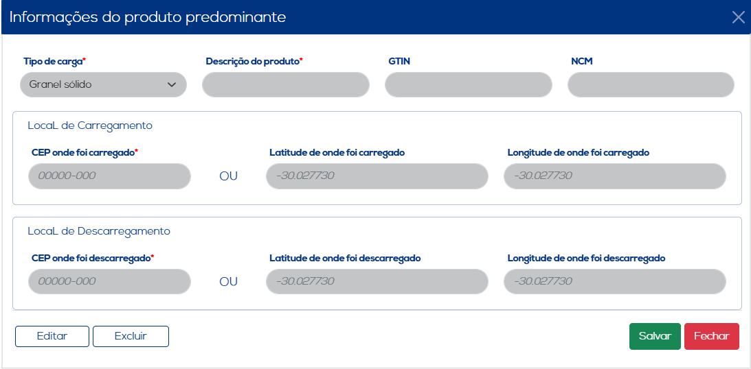Informações do Produto Predominante: Nesta opção o usuário precisará informar o tipo de carga, a descrição do produto e a localização mais exata do carregamento e descarregamento através do CEP dos municípios informados, ou por meio das informações latitude de onde foi carregado/descarregado e longitude de onde foi carregado/descarregado. Ao concluir a inclusão dos dados, clique no botão "Inserir" para salvar as informações. Os dados inseridos serão listados, juntamente com as opções de edição e exclusão.