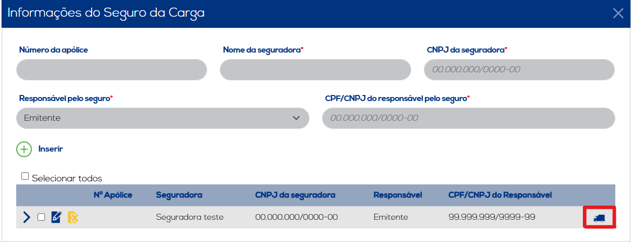 Informações do Seguro: Indique um responsável pela carga e eventuais riscos que ela venha sofrer durante a operação de transporte. Ao concluir a inclusão dos dados, clique no botão "Inserir" para salvar as informações. Os dados inseridos serão listados, juntamente com as opções de edição e exclusão.