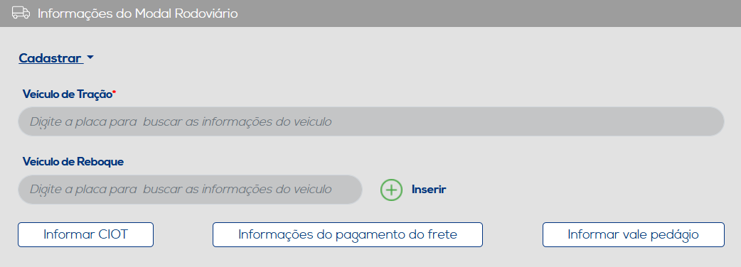 Caso tenha realizado o cadastro de veículos, inicie a digitação da placa do veículo para que o InvoiCy localize o cadastro e carregue as informações. No entanto, se este cadastro não foi realizado, clique sobre a opção "Cadastrar", localizada no canto esquerdo deste grupo, e selecione a opção desejada.