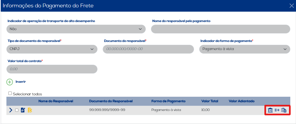 Informações do Pagamento do Frete: Indique as informações referentes ao pagamento do frete, como o tipo de documento do responsável, o valor total do contrato e o documento do responsável, e também as informações opcionais. Ao concluir a inclusão dos dados, clique no botão "Inserir" para salvar as informações. Os dados inseridos serão listados, juntamente com as opções de edição e exclusão.
