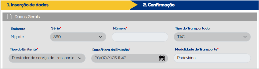 No grupo "Dados Gerais" informe a série, o tipo do transportador, tipo do emitente, entre outras informações necessárias para a emissão, que podem ser observadas a seguir: