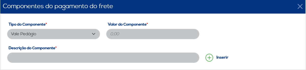 No segundo ícone, serão exibidas as informações relacionadas aos gastos do frete e como foram esses gastos, por meio de opções como o tipo do componente, o valor do componente e a descrição do componente. Ao concluir a inclusão dos dados, clique no botão "Inserir" para salvar as informações. Os dados inseridos serão listados, juntamente com as opções de editar e excluir.