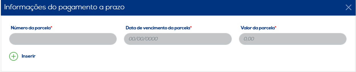E o terceiro ícone apresenta as informações referentes aos pagamentos realizados à prazo. Informe o número da parcela, a data de vencimento da parcela e o seu respectivo valor. Ao concluir a inclusão destes dados, clique no botão "Inserir" para salvar as informações. Os dados inseridos serão listados, juntamente com as opções de editar e excluir.