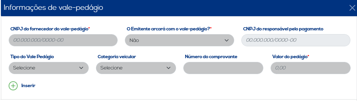 Informar Vale-Pedágio: Nesta opção inclua obrigatoriamente os dados do vale-pedágio que acompanha o transporte de cargas, indicando o CNPJ do fornecedor do vale-pedágio e o valor do pedágio, e selecionando se o emitente arcará com o vale-pedágio, dentre outras informações opcionais. Ao concluir a inserção dos dados, clique no botão "Inserir" para salvar as informações. Os dados incluídos serão listados, juntamente com as opções de edição e exclusão.
