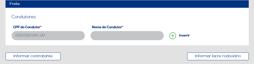 O grupo "Frete" permite preencher os dados do condutor que realizará o transporte da carga, sendo estas informações de extrema importância para a emissão do documento. Ao concluir a inserção dos dados, clique no botão "Inserir" para salvar as informações. Os dados incluídos serão listados, juntamente com as opções de editar e excluir.