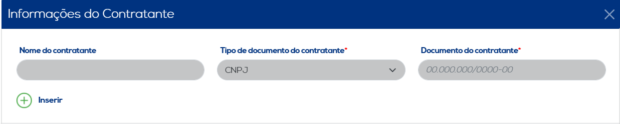 Informar Contratante: Apresenta as informações relacionadas ao contratante do transporte do documento. Ressaltando que, se houver mais de um contratante, este também poderá ser cadastrado pelo usuário. Ao concluir a inserção dos dados, clique no botão "Inserir" para salvar as informações. Os dados incluídos serão listados, juntamente com as opções de editar e excluir.