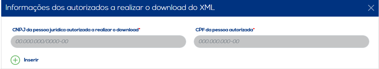 Autorizar o Download do XML: Através desta opção é possível adicionar os autorizados a realizar o download do XML, por meio da inserção de informações referentes aos mesmos, como o CNPJ da pessoa jurídica ou da pessoa física autorizada a realizar o download do XML. Ao concluir a inserção dos dados, clique no botão "Inserir" para salvar as informações. Os dados incluídos serão listados, juntamente com as opções de edição e exclusão.