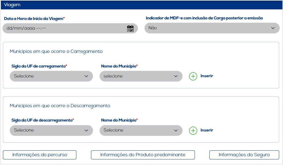 Nos Municípios em que Ocorre o Carregamento e nos Municípios em que Ocorre o Descarregamento, é possível filtrar os estados, e posteriormente os municípios em que irão realizar o carregamento ou descarregamento, através das respectivas opções: Sigla da UF de Carregamento/Descarregamento e Nome do município. Ao informar o estado e o município, o usuário deverá "Inserir" essas informações ao documento, podendo definir a UF como Inicial ou Final, conforme necessário.