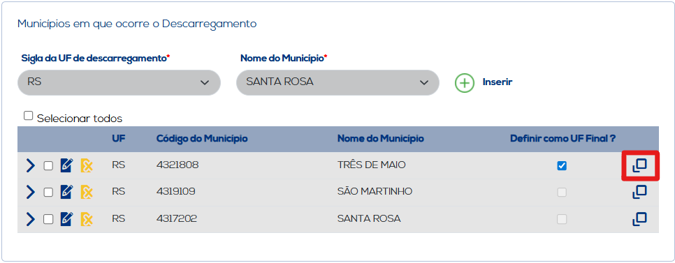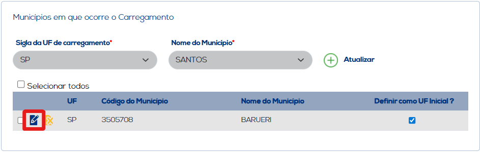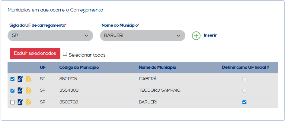 Ao selecionar todos os municípios informados no carregamento/descarregamento, a opção de "Excluir Selecionados" será apresentada para excluir quaisquer informações que estejam selecionadas, ou opte por "Selecionar Todos" e clique na opção descrita anteriormente para excluir todos as informações que tenham sido inseridas.
