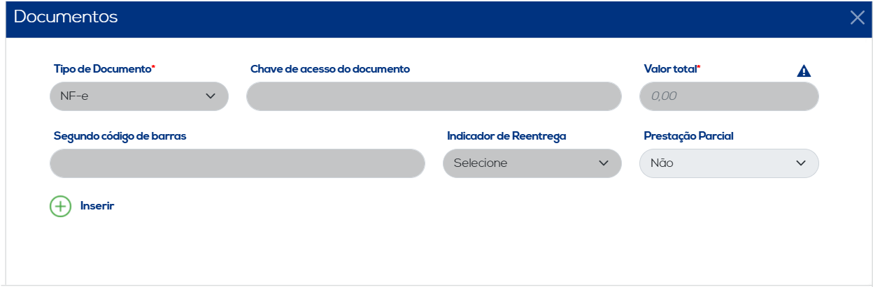 Ao selecionar a opção "Documentos" será apresentada uma nova tela. Nesta tela devem ser informados dados sobre o documento fiscal que será vinculado ao MDF-e, conforme a necessidade. Após finalizar, é preciso clicar no botão "Inserir" para salvar as informações. Os dados inseridos serão listados, juntamente com as opções de editar e excluir.
