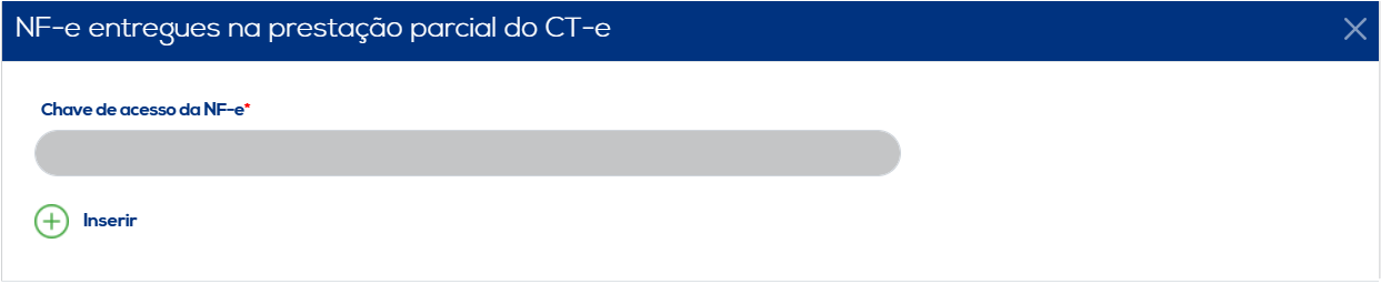 Neste primeiro ícone, o campo para inserir a chave da respectiva NF-e entregue na prestação parcial será apresentado. Ao concluir a inclusão dos dados, clique no botão "Inserir" para salvar as informações. Os dados inseridos serão listados, juntamente com as opções de editar e excluir.