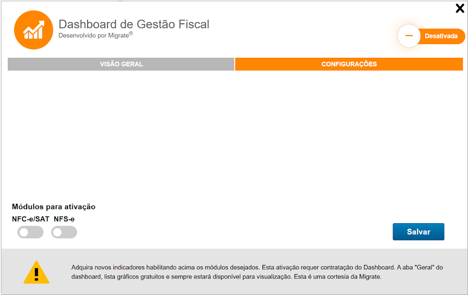 Na aba "Configurações" se encontra a opção de ativar a extensão. Para ativá-la, selecione o módulo NFC-e e/ou NFS-e. Após concluir as configurações, clique em "Salvar". A ativação será realizada automaticamente, permitindo que a extensão seja habilitada ou desabilitada conforme necessário.