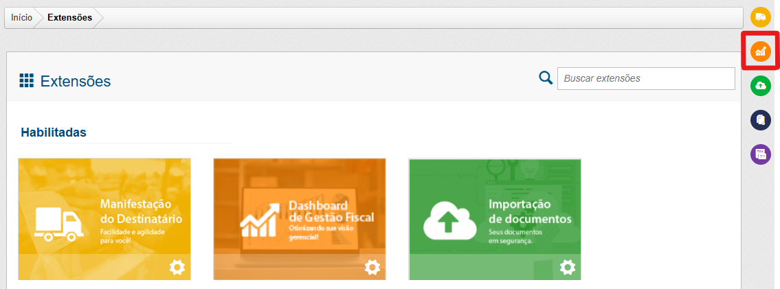 Para realizar a ativação desse serviço, abra a janela de "Extensões" no canto superior direito do InvoiCy e clique no ícone da extensão "Dashboards".