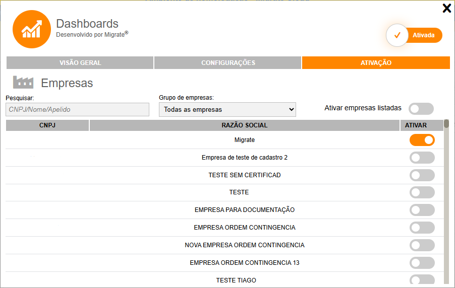 Dentro da aba "Ativação", serão apresentadas as empresas vinculadas com a chave do parceiro, podendo ativar o acesso do usuário normal ao Dashboard, liberando os gráficos e informações das empresas que esse mesmo usuário possui acesso, através dessa configuração.
