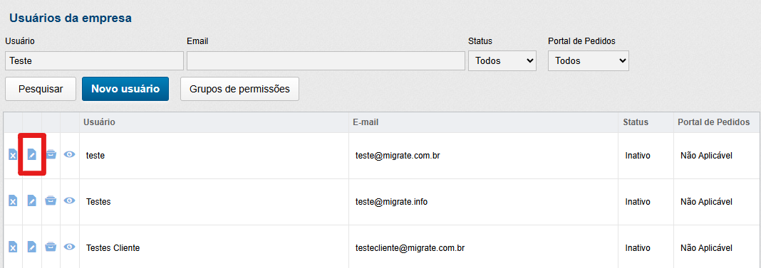 Em seguida, selecionar o usuário que pretende bloquear o acesso a extensão na tela "Usuários da empresa", através da opção "Editar", conforme destacado abaixo: