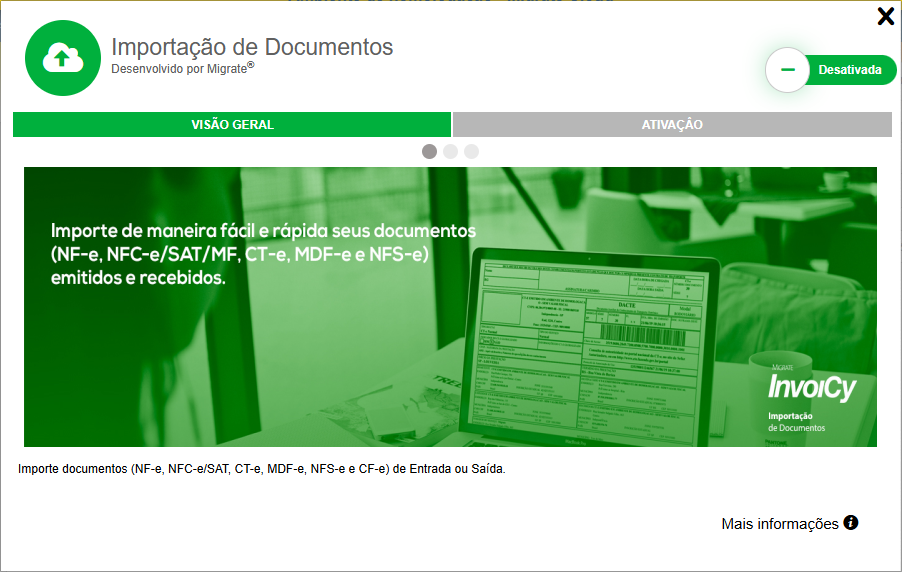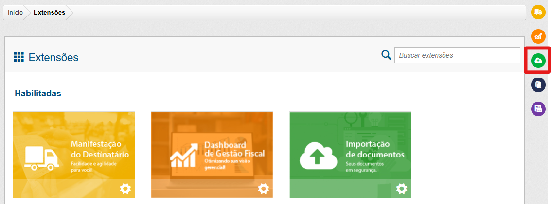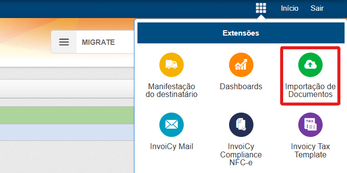 Para realizar a ativação desse serviço, abra a janela de "Extensões" no canto superior direito do InvoiCy e clique no ícone da extensão "Importação de Documentos".