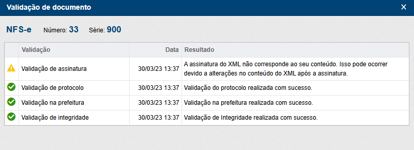 Somente os documentos com a data de emissão posterior a ativação dessa extensão serão consultados. Caso a data de emissão seja anterior a ativação, um alerta será exibido na tela. Se alguma validação não for concluída com sucesso, um ícone de alerta será exibido, apresentando uma mensagem sobre o retorno da validação. Caso alguma validação esteja sinalizada como pendente, o usuário pode executá-la através do botão "Atualizar".