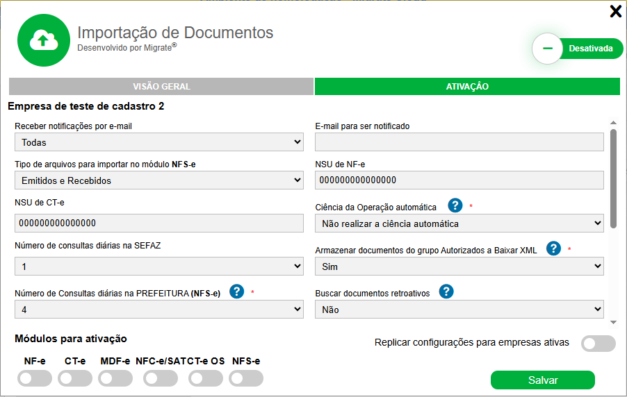 Na aba "Ativação" se encontra a opção de ativar a extensão. Para ativá-la, selecione o módulo NF-e, NFC-e, CT-e, MDF-e, NFS-e e/ou CTeOS, e configure os seguintes parâmetros: