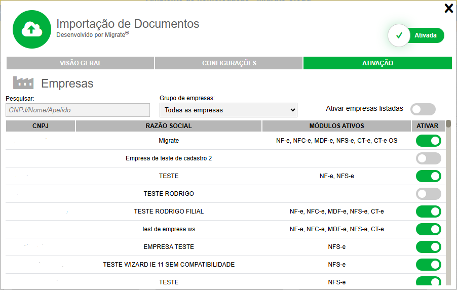 Dentro da aba "Configurações", após a ativação, é possível replicar as configurações para as demais empresas. No entanto, os parâmetros NSU não podem ser replicados, pois são específicos de cada empresa. Uma nova aba chamada "Ativação" (diferente da anterior) será adicionada. Ela reúne todas as empresas às quais o usuário possui acesso, permitindo ativar, desativar ou reativar a extensão em pauta nas empresas listadas.