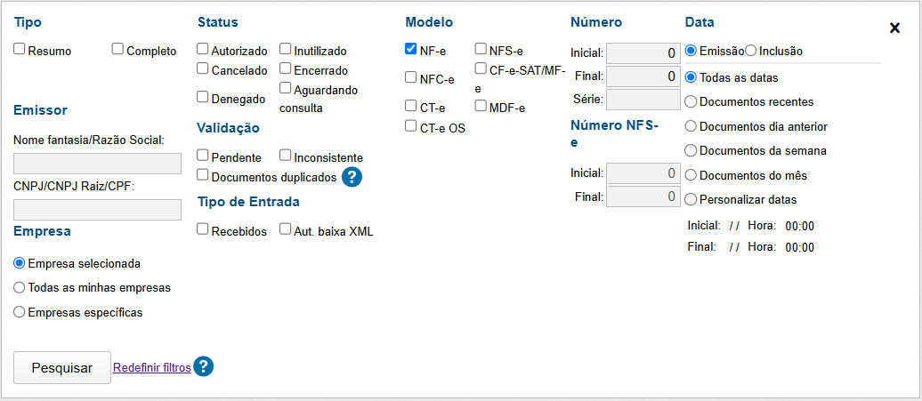 Além disso, é possível usar os filtros de Validação (pendente ou inconsistente), selecionar o Tipo de Entrada (recebidos ou com autorização para baixar XML) e definir o escopo da pesquisa por Empresa (selecionada, todas ou específicas).